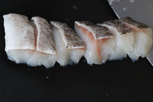 1) タラは骨があれば取り除き、厚さ7mm程度のそぎ切りにして、塩とこしょうを全体に軽くまぶす。