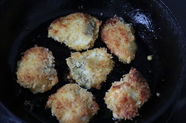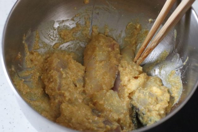 ※衣が余らないよう、しっかりと魚にまぶしてください。