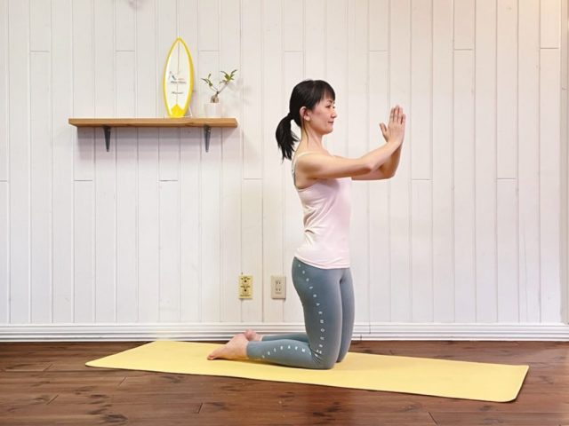 1) 膝立ちになり両手の平を合わせておでこの高さまで上げ、息を吸って準備する