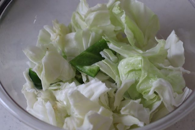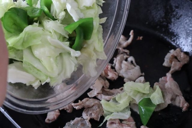 1) 豚こま肉は一口大に、キャベツはザク切り、ピーマンは一口大に、たまねぎは薄切りにする。
