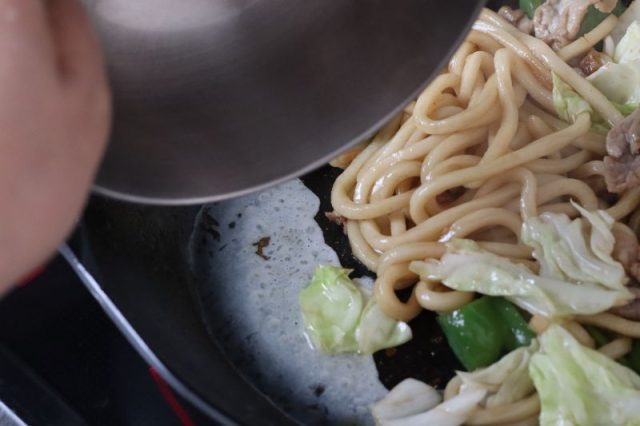 ※野菜の水分でうどんがほぐれますので、うまみの出た野菜の水分は捨てずに一緒に炒めます。全体を炒めながら水分はしっかりとばしてください。