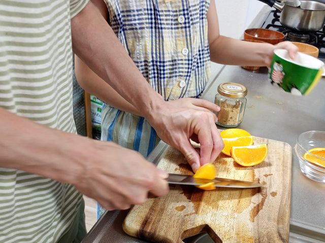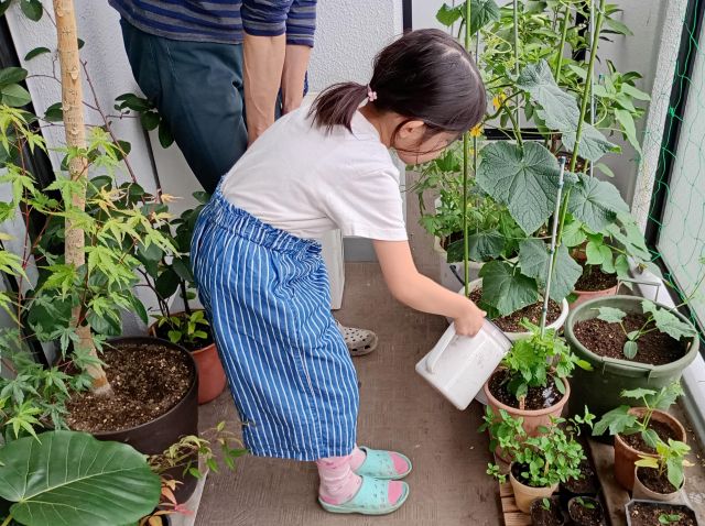 その後、夫と娘が一緒にベランダの植物に水をやり、着替えをして、洗濯物をたたみます。ベランダでは少しですが野菜や果樹を育てていて、時期によっては受粉や収穫をすることも。家族みんなが楽しみにしている時間です。