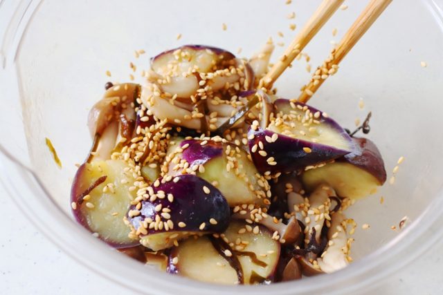 さらにうれしいのは、「酢」が、なすの色をきれいに保ってくれること。鮮やかに仕上がると気分も上がりますよね!