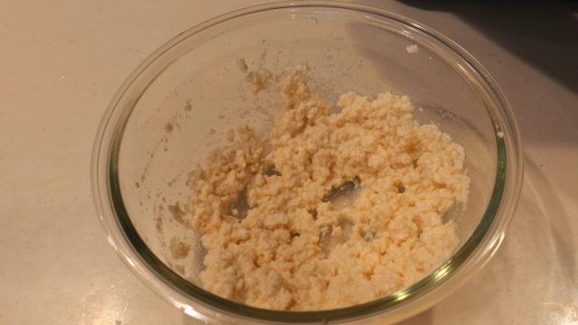 1) 豆腐を滑らかになるまで潰し、片栗粉を加えてよく混ぜる。