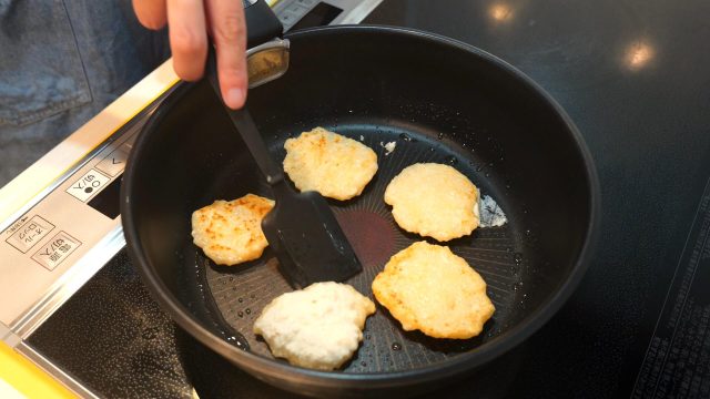 2) フライパンに薄く油をひき、(1)をスプーンですくって落とし、弱めの中火で両面こんがり焼く。