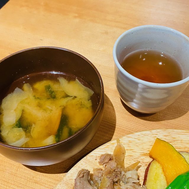 まあるいミニおにぎりと、食べ切りしやすいおかずがセットになっています。お味噌汁とお茶もついていて、和食が好きな人におすすめしたいメニューです。