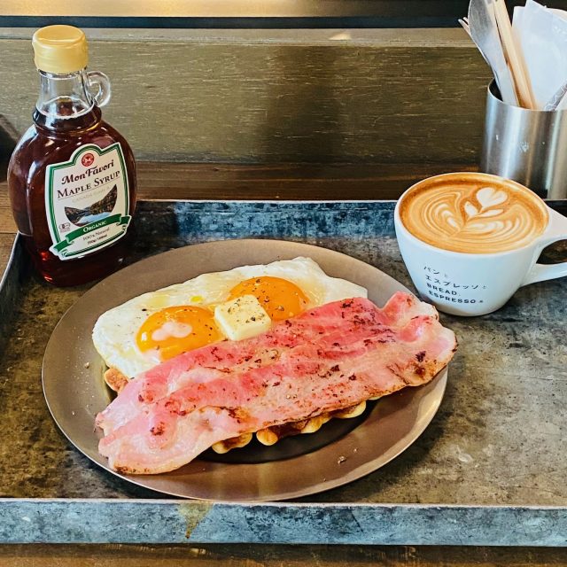 この日あやさんが食べたのは「ベーコンエッグ」のワッフルプレート。ワッフルの上に、ベーコン2枚と目玉焼き2つ、バターがトッピングされていて、ボリュームたっぷりな一皿です。