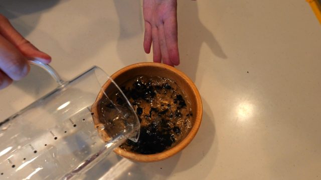 2) 乾燥わかめを手で砕いて、水に5分戻す。