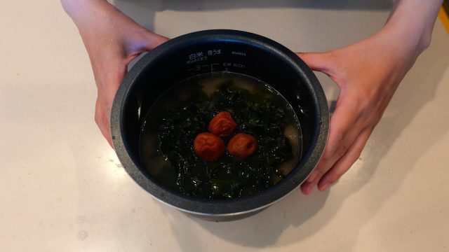 3) お釜に米→(A)→水の順に入れて混ぜ、水分を絞ったわかめと梅をのせて普通炊飯する。