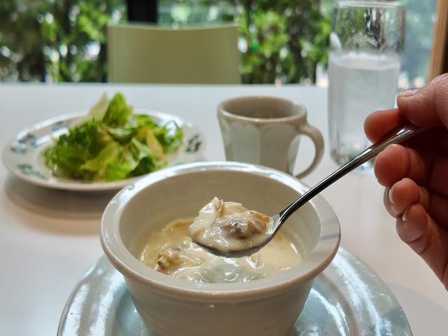 クラムチャウダーは熱々で、とにかくたっぷりのアサリが入っているのが特徴的。しかもアサリが大きいから、噛み締めた時の弾力と旨味が最高に美味しい!コク深くしっかりめの味付けで、クッペとよく合います。