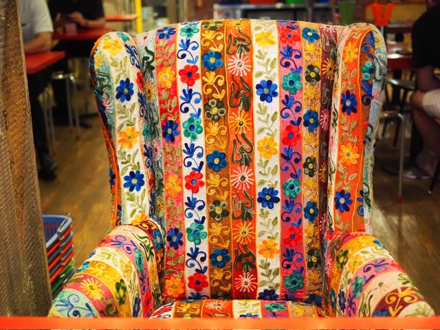 7時をちょっと過ぎた頃、席は3割ほどうまっていました。店内にはカウンター席とテーブル席、合計34席があります。店員さんに声をかけると、「お好きなお席へどうぞ。注文はお席のQRコードからお願いします」とのこと。店内を見渡すと、ひときわ目を惹く椅子が1つ見えました。ちょうどその席が空いていたので、座らせていただくことに。色味が鮮やかで、お花柄がとっても可愛いですよね。背もたれもあって、座り心地も抜群です。