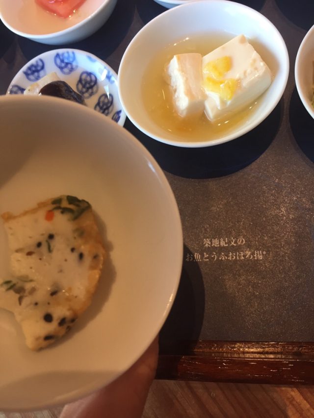 東京ソトアサごはん会のしろさんいわく、築地ゆかりの品々が登場しているそう。こちらは築地紀文のお魚とうふおぼろ揚なんですって。