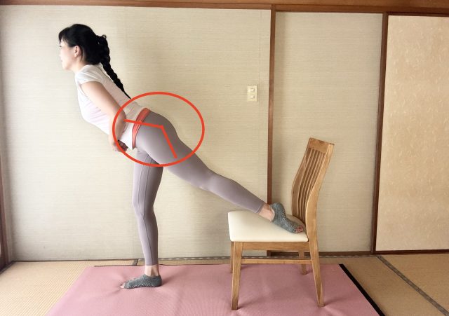 1)【内もものストレッチ】片脚をイスの上に乗せ、上半身を股関節から折りたたむように前傾させる