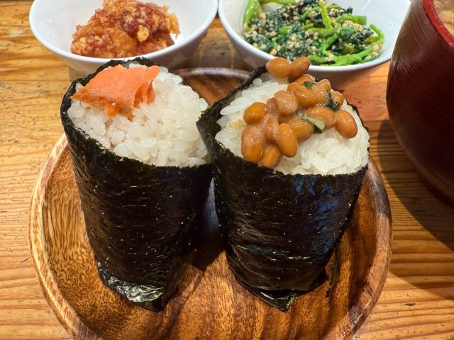 にぎりめしは、人気のシャケ、卵黄納豆。豚汁大、ほうれんそう胡麻和え、そしておいしそうな揚げたての唐揚げをいただきました。