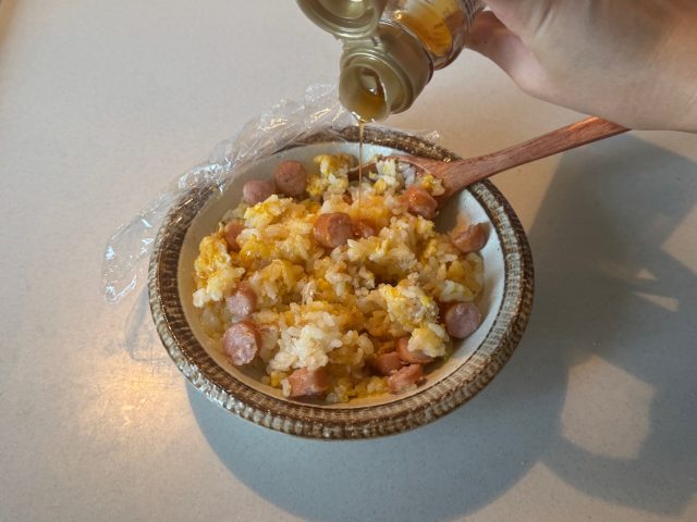 【4】レンジから取り出して、ごま油を加えて全体を混ぜ、再び40秒加熱して仕上げる。