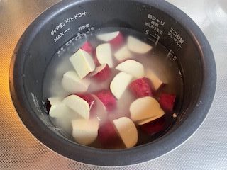 【5】水気を切ったサツマイモをのせ、炊飯器で予約