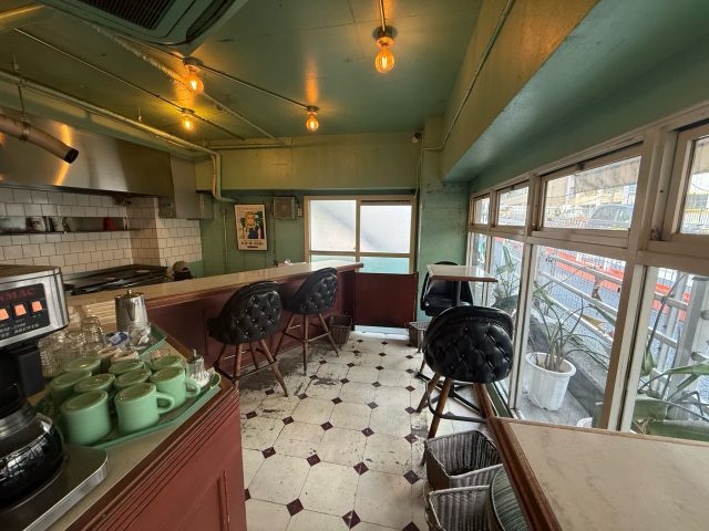 店内には古き良きアメリカな感じの素敵なカウンター席とハイチェアのテーブル席。