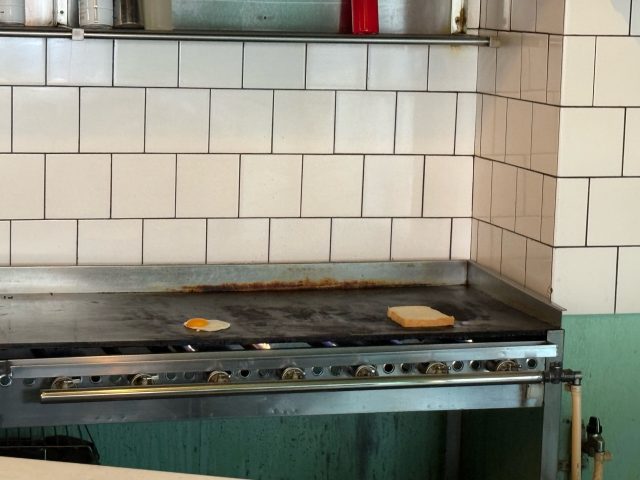 鉄板の上で私のトーストと目玉焼きが焼かれております。鉄板で焼くトーストって最高においしいと私は思う。