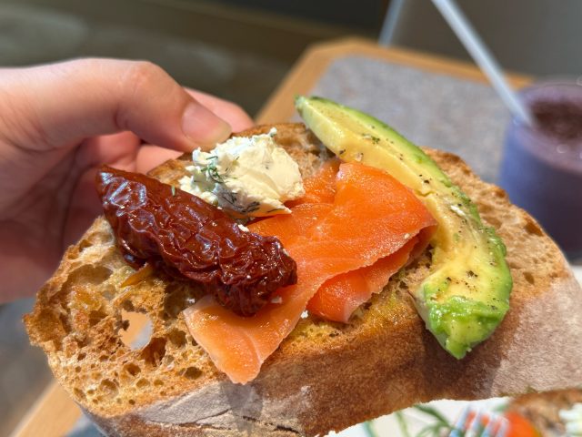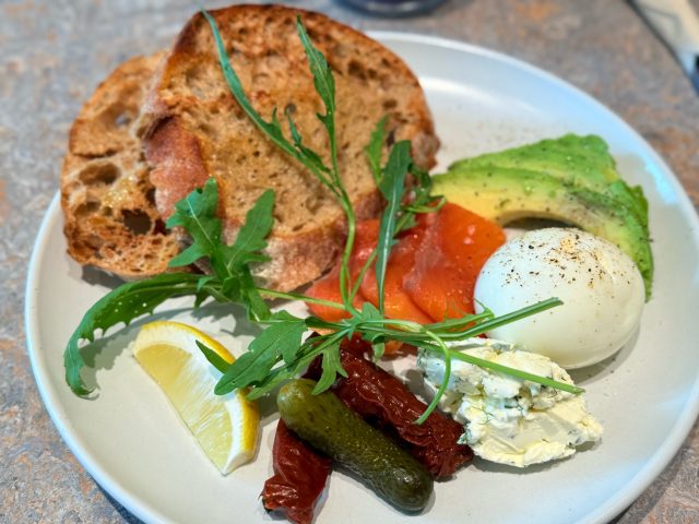 プレートはアボガド、サーモン、ドライトマト、チーズ、ポーチドエッグと具材色々。朝から元気が出ます。