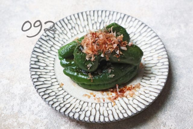 【3】熱いうちに醤油・ごま油・かつおぶしをかけて完成。てきたてを食べるとジューシーなピーマンエキスが飛び出すので注意してください。