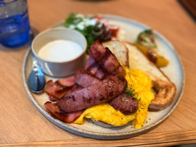 さて朝食をオーダー。モーニングメニューからテーブルにある端末でオーダーしたのはビッグブレッキー。パンに卵焼き、ソーセージやベーコンがのり、お野菜も豊富。