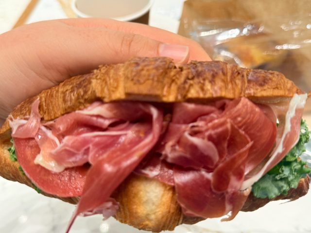 生ハムは巨大!今までたくさんの生ハム入りサンドを食べてきたけれど、ここはトップレベルかも。塩気がちょうど良くてパンとも相性抜群でした。