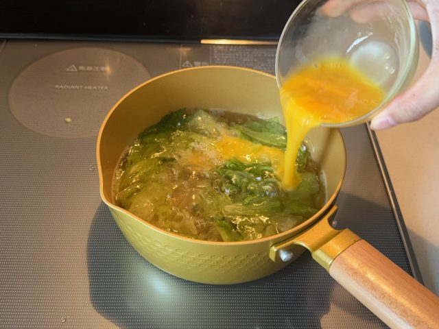 【3】春雨が柔らかくなったら、卵を溶いて流し入れる。
