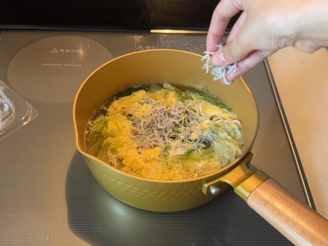 【4】卵がふわっと固まったらしらすを入れ、塩で味を調整したら完成。