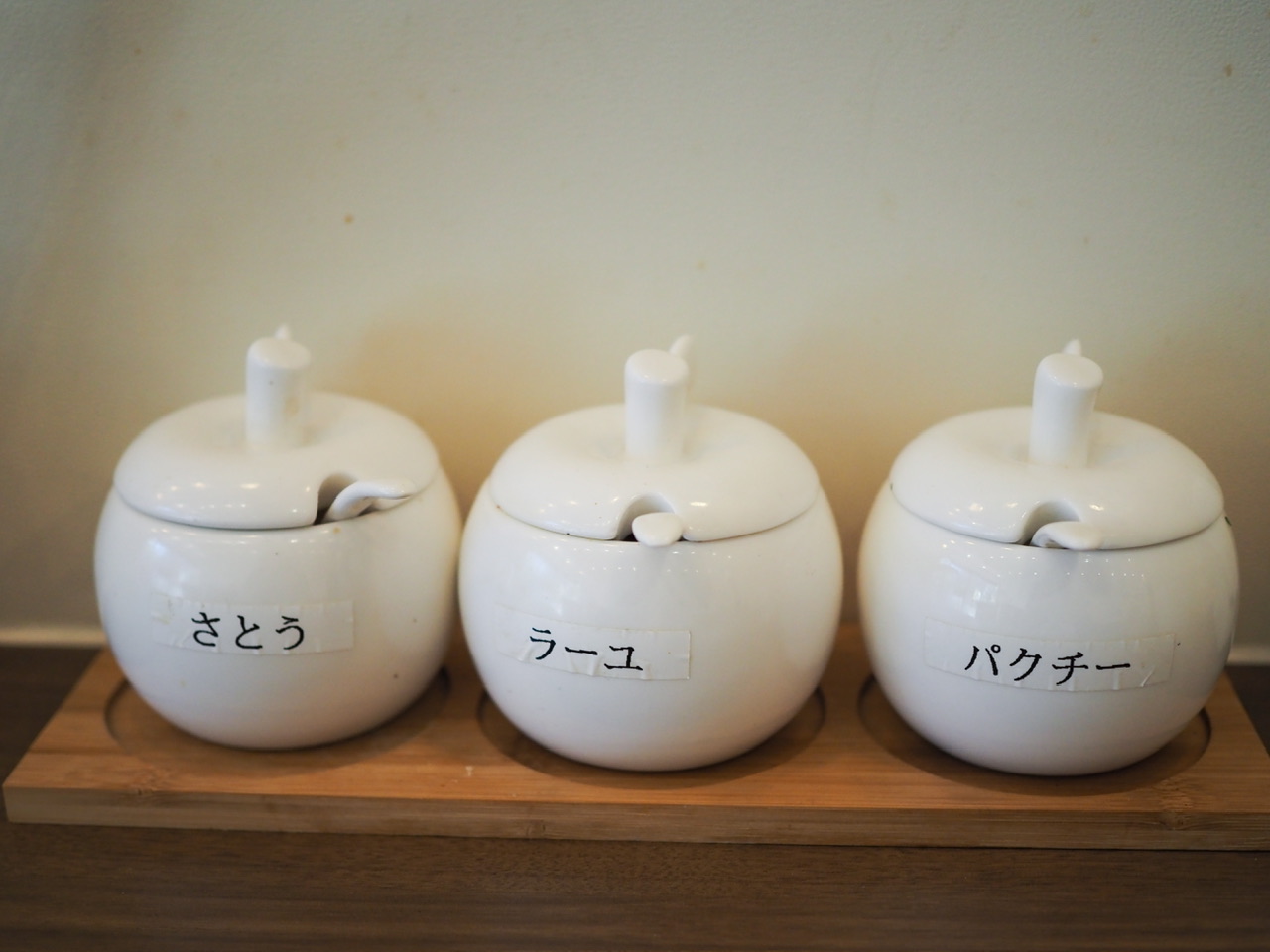 卓上には砂糖、ラー油、パクチーが並んでいました。