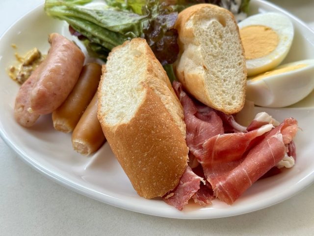 生ハム、日替わりパン、日替わりソーセージ、サラダ、ゆで卵、ケーキ、ドリンクがセットになっています。