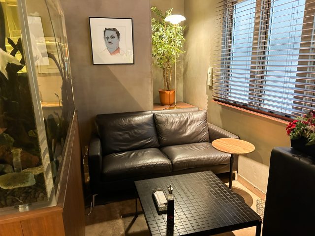 ソファ席の横には水槽も。植物や水のゆらぎに癒やされ、つい長居したくなりますが、混雑時は90分制とのこと。