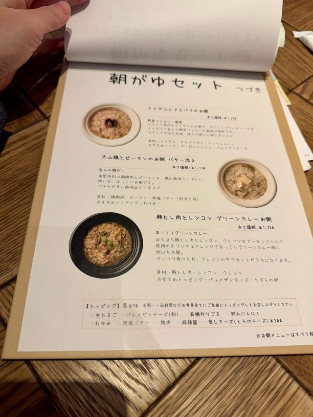 平日はバルとして夕方から営業していますが、土日祝は朝8時からオープンし、朝粥メニューを用意しています。