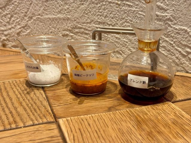テーブルには、こだわりお塩、麻辣ピーナッツ、ブレンド酢の調味料もあるので、味変を楽しむこともできます。