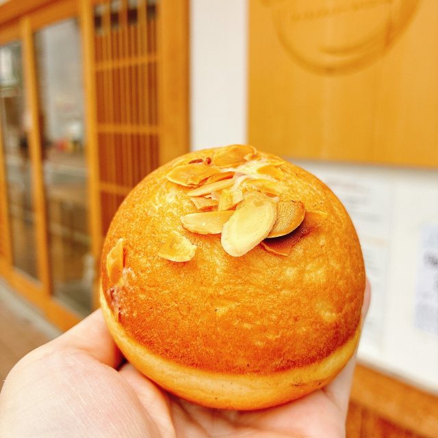 表面の焼き色が濃いので、もしかしたら程よい弾力、かたさはあるのかな?と思いきや、生地はシフォンケーキのように柔らかく、ふんわりほどける口あたり。中にはなめらかなカスタードクリームが想像した通りたっぷり入っていて、ほどよい甘さとコクのある旨みが広がります。さらに上にトッピングされたアーモンドスライスの香ばしさが良いアクセントになっていましたよ。