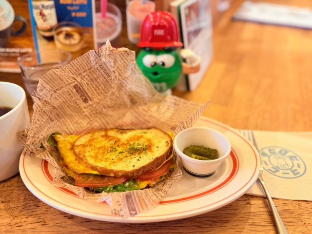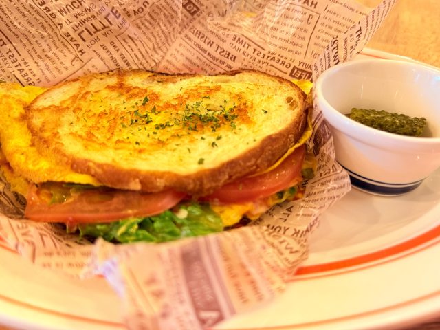 焼き立ての卵焼き、ベーコン、お野菜から出る旨味を程よい厚さのパンが吸い込み、おいしー!