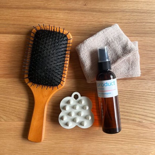シャンプー→タオルドライの後で頭皮につけ、30秒ほど指またはマッサージブラシ(写真右)でマッサージすると、ハーブの上質な香りにいやされつつ頭皮ケアができるスカルプケアエッセンスです。