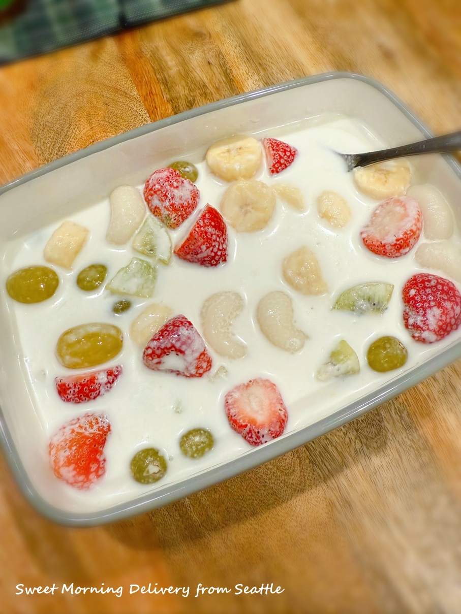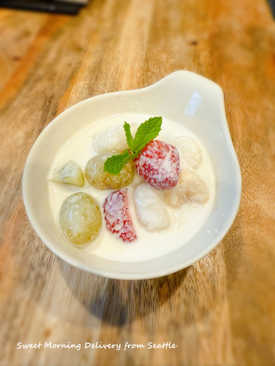 タイカレーを作ると微妙な量余るココナッツミルク。今日は牛乳&練乳、フルーツを追加して「フルーツ鍋」にしてみました。
