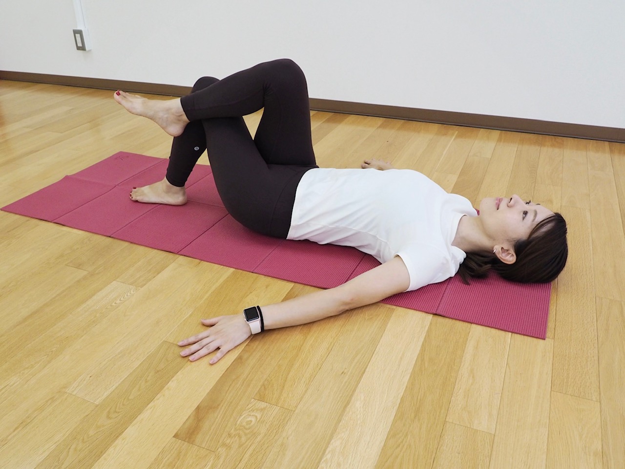 1)仰向けになり、足を腰幅に開く。腕は、体の横やお腹の上など楽なところでOK!