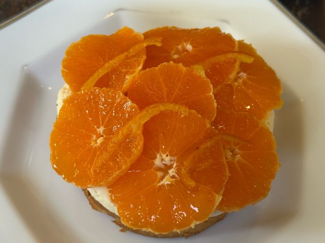 和歌山•蔵光農園のゆら早生みかんのタルト•トロベジェンヌです!みかんの皮で香りをつけたシロップにしっかり浸したブリオッシュの上に、みかんのマーマレードとクリームがたっぷりのり、その上にスライスしたみかんがのっています。