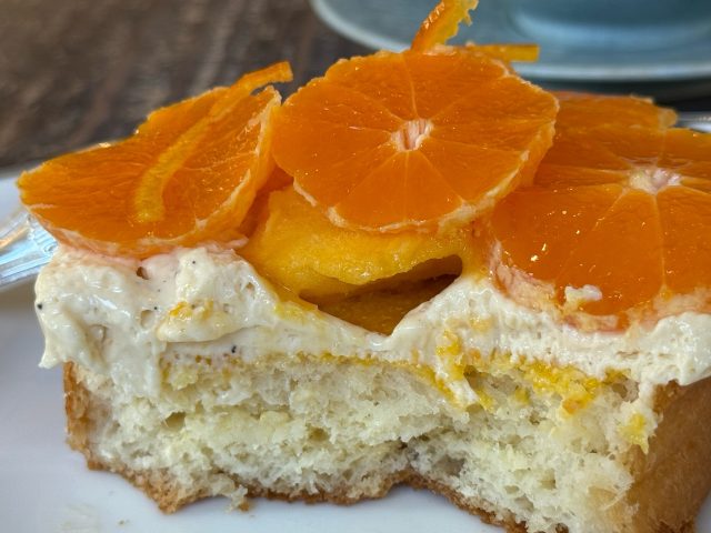 ブリオッシュ生地ってともするとパサパサしがちですが、シロップが良い仕事をしていて上のクリームやスライスしたみかんと絶妙な一体感!こんなおいしいブリオッシュを使ったスイーツは初めてです!