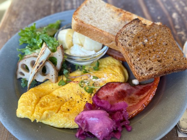 ふわっふわでとろっとろのオムレツ、しっかりソテーされた焼き野菜、紫キャベツのピクルスの程よい酸味。