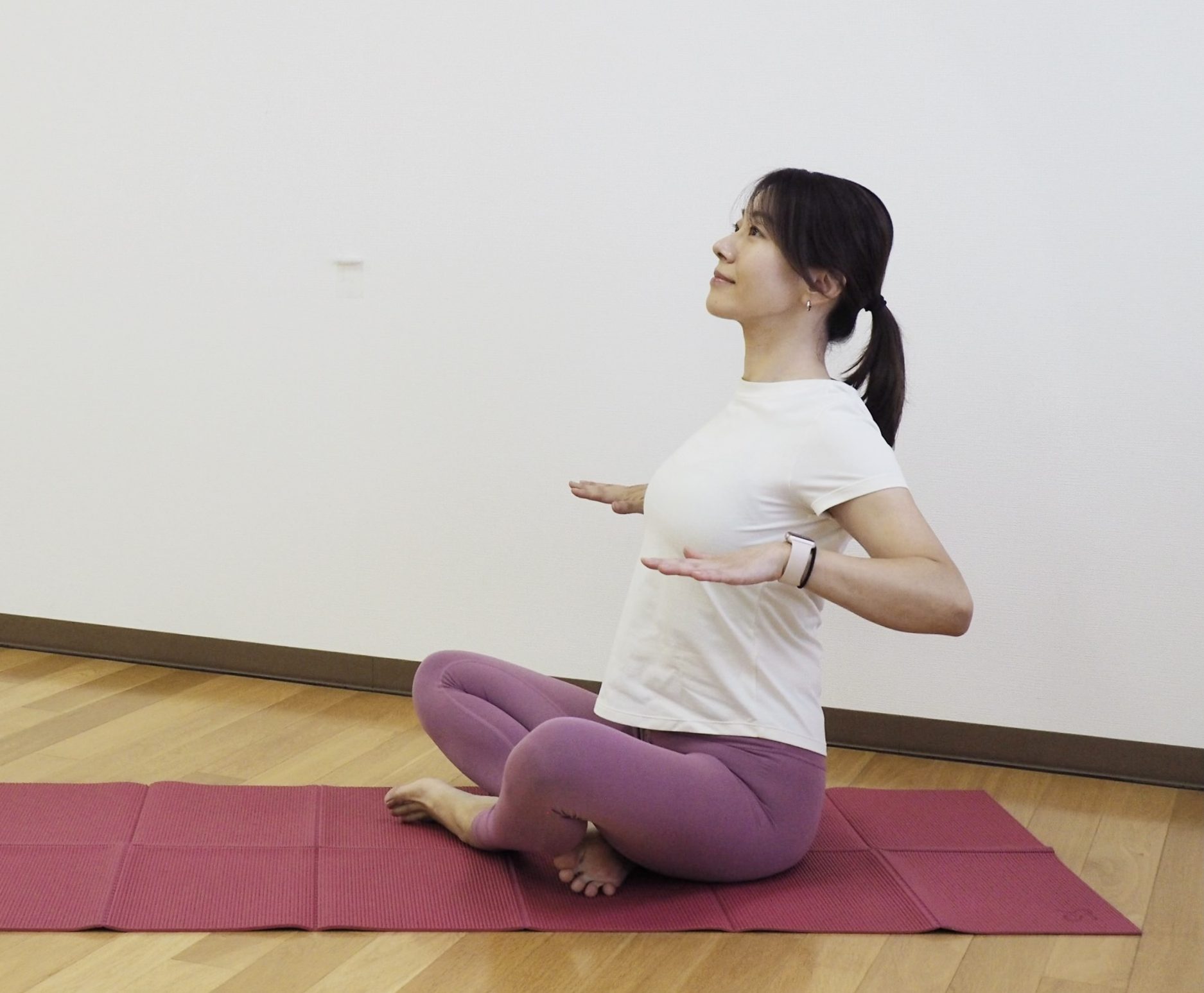 - 腕を背面にまわすことで、背中が丸まりにくくなる
