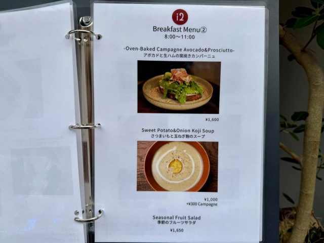 モーニングメニューはフレンチトーストのプレートやグラノーラ、アボカドと生ハムの窯焼きカンパーニュ、さつまいもと玉ねぎ麹のスープがあります。