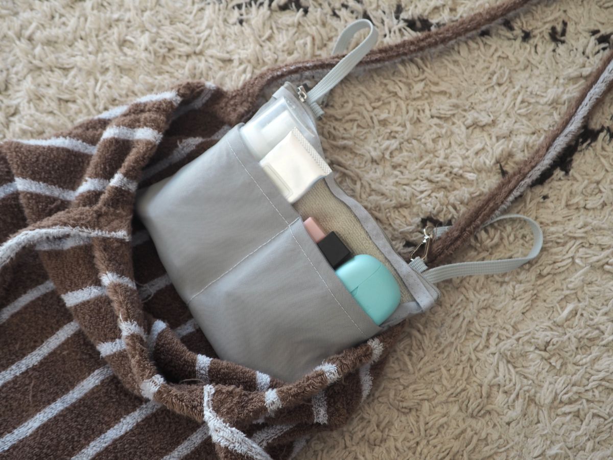 私が中に入れたものはこんな感じです。600mlの水筒はもちろん、イヤホンやスマホなどの必需品や文庫本まで入って完璧です。愛用中の「タフかるポーチ」は入れられませんでしたが、リップと鏡だけあれば正直十分。両サイドに付いているポケットに入れて埋まらないようにしました。
