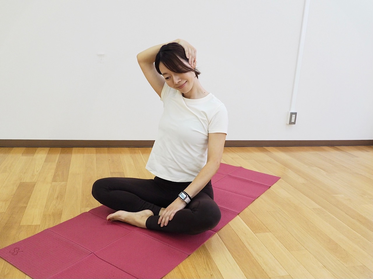- 肩が上がってこないように、優しい力で押さえると首の伸びが深まる