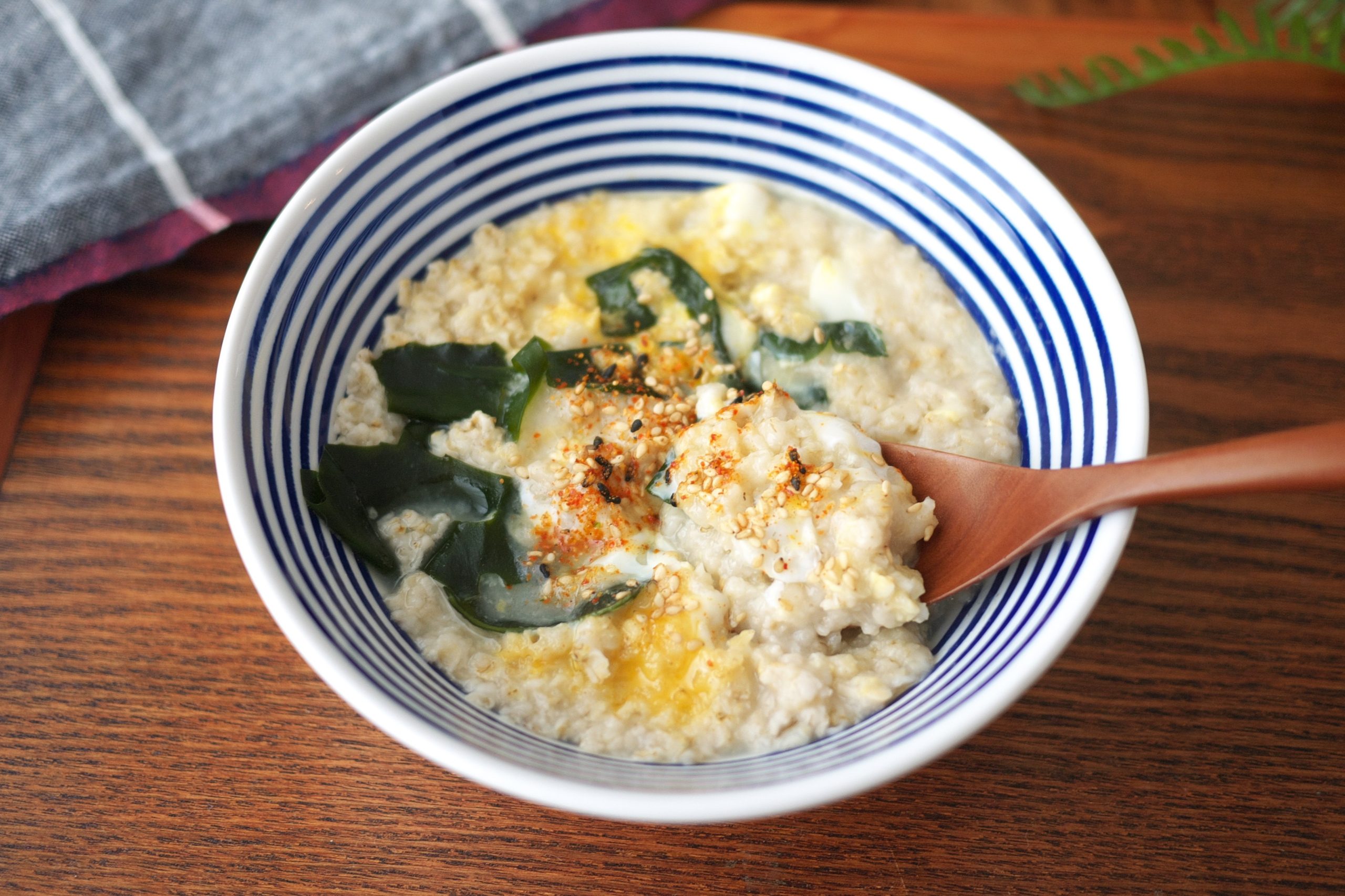 オートミールで食物繊維を補いながら、ビタミンやミネラルも一緒にチャージ♪余った野菜や乾燥わかめなどで、気軽にアレンジできるのも魅力です。