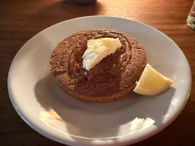 バターは少し塩気があって、ホットケーキの甘さとのマリアージュが最高!全粒粉の粉の優しい甘味も感じます。