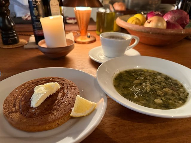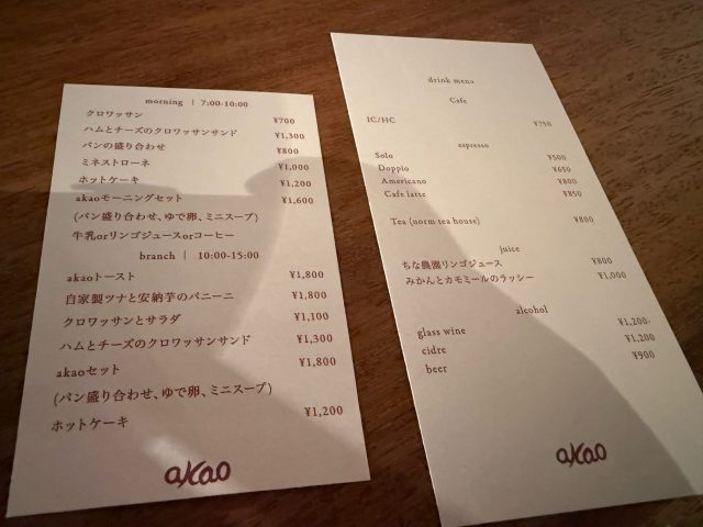 メニューが豊富!akaoモーニングセットも気になる中、今日はホットケーキとミネストローネをいただき。