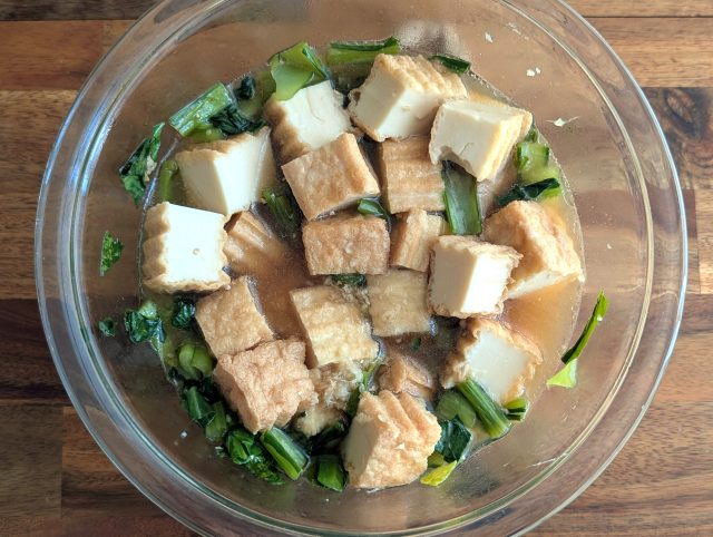 【1】小松菜と厚揚げは食べやすい大きさに切る。