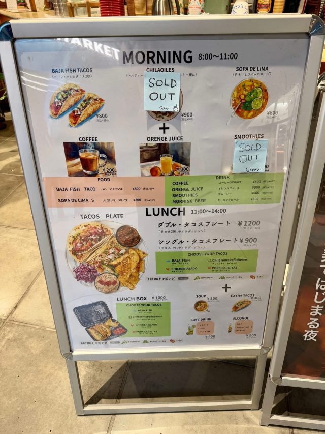 そのT-MARKETの入口付近にあるタコス屋さん「Tacos donde sea」は、なんとモーニングメニューがありました。